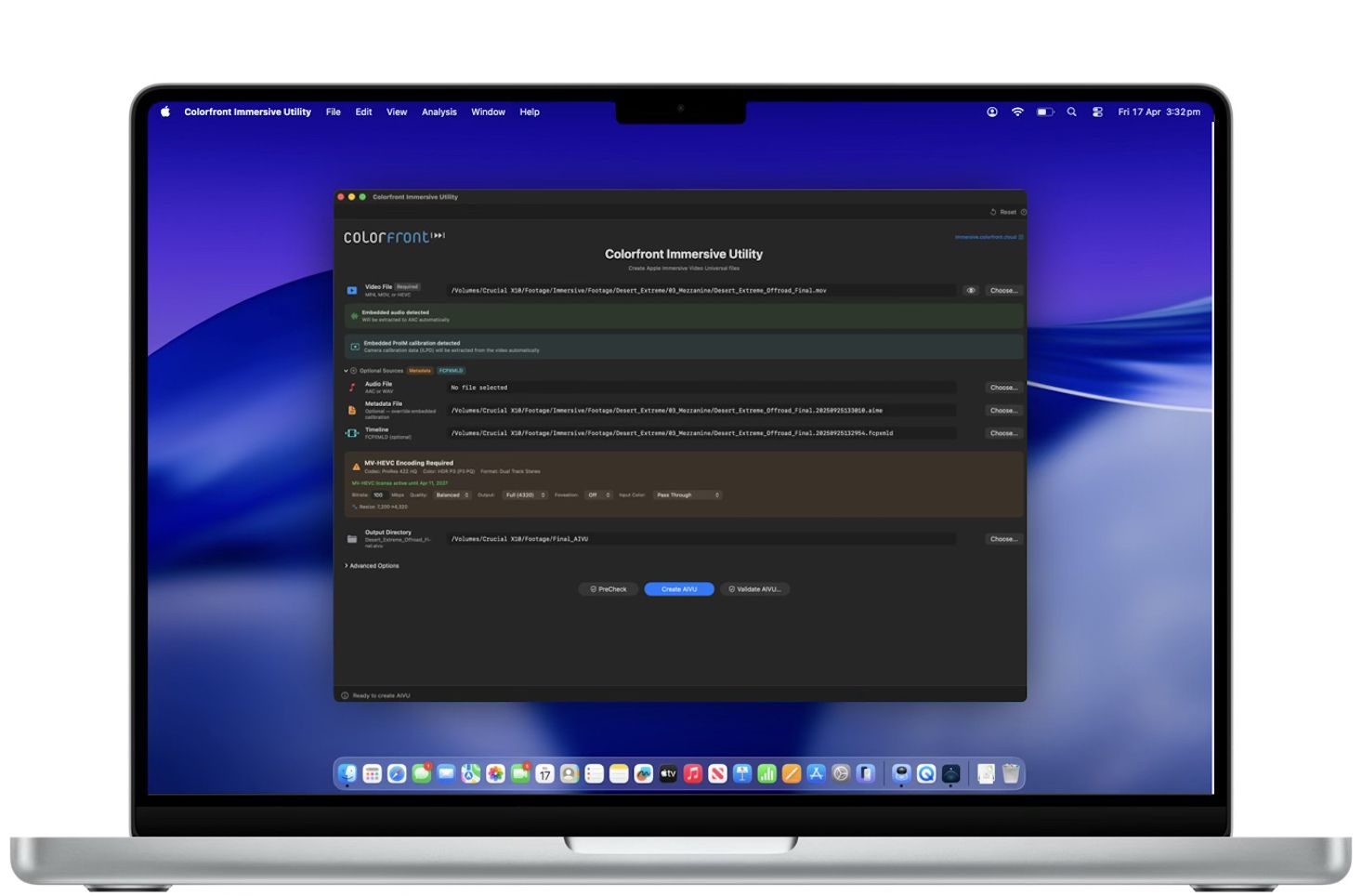 Colorfront Immersive Utility streamlines the process for preparing immersive video content for Apple Vision Pro with a single app. Users select a video file, a metadata file containing camera intrinsics, and an output directory. The app can also auto-detect ILPD calibration data embedded directly in the source video, so a separate metadata file isn't always required. From there, users simply click Create AIVU, and the app handles encoding, audio extraction, and packaging automatically.