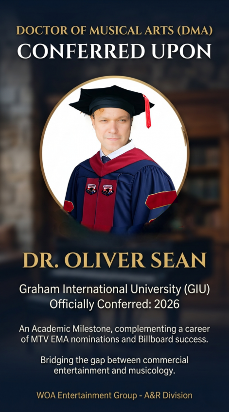 FARO, Portugal - nvtip -- Independent music icon and filmmaker Oliver Sean Alvares, known professionally as Oliver Sean, has been officially conferred the degree of Doctor of Musical Arts (DMA) from Graham International University (GIU). This professional doctorate marks a defining academic milestone for the multiple Billboard Top 10 artist, following a multi-year period of advanced research and performance practice.